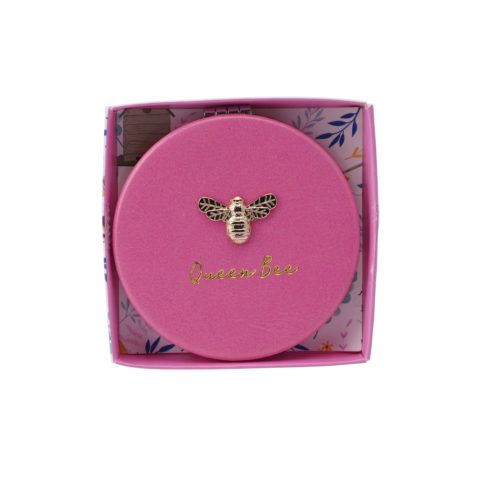 Bee yourself with this lovely compact mirror featuring a busy bumblebee design in pink and the slogan Queen Bee